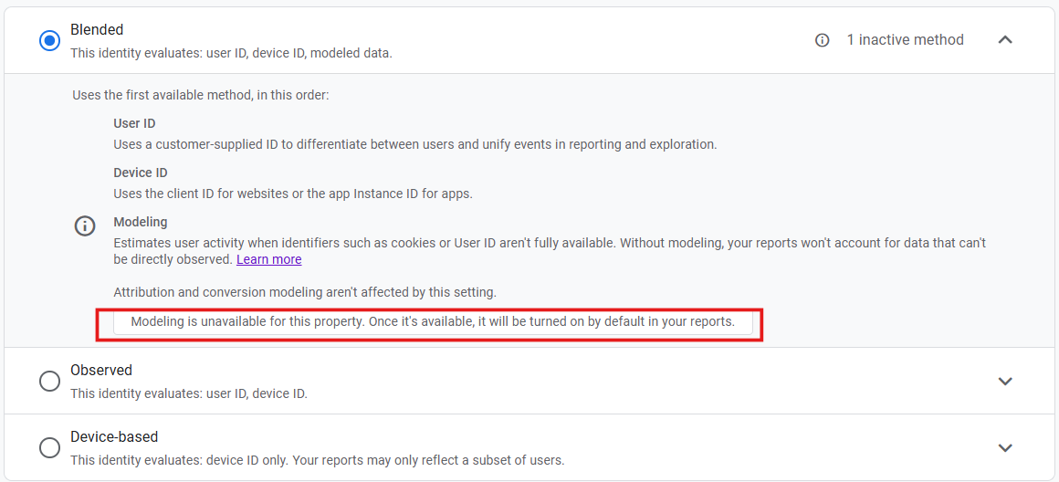 Blended data combines consented and unconsented event hit as part of the modelling process. The unconsented event hits do not contain user cookie ID and traffic source information, but Google Analytics uses these anonymised event data to estimate session and channel data. You need to make sure that the modelling is activated. If you see this message: ‘1 inactive method’ and ‘modelling is unavailable for this property. Once it’s available, it will be turned on by default in your reports’, that means modelling hasn’t been triggered: