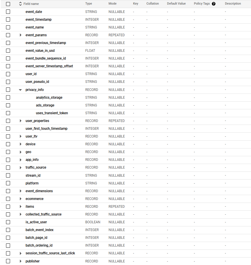 - It only contains hit-level traffic source data (All fields under ‘collect_traffic_source’), session-level or user-level traffic source fields such as those under ‘session_traffic_source_last_click’ and ‘traffic_source’ are not yet processed.