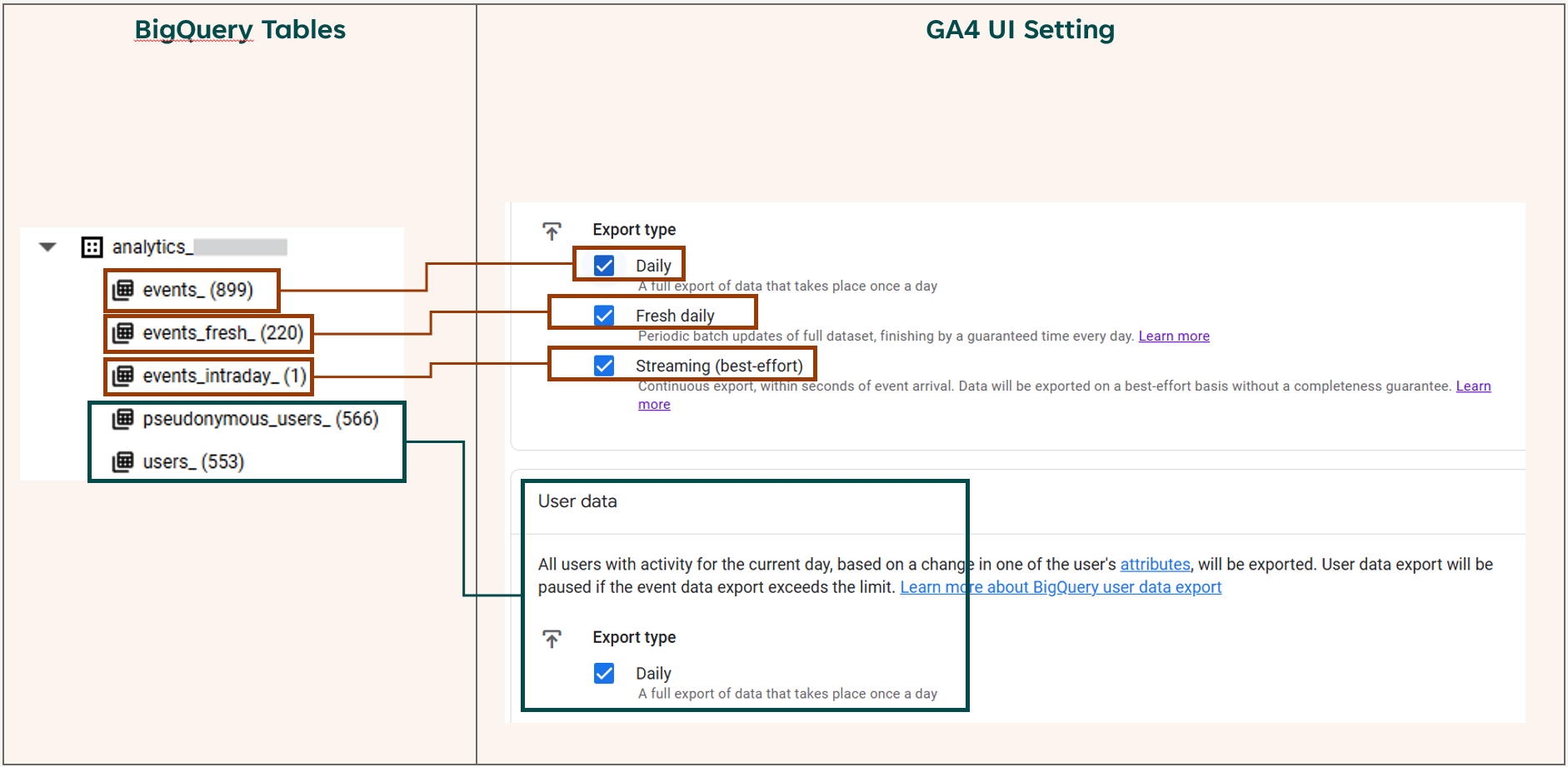 You can choose to connect these tables when linking a BigQuery project in Google Analytics UI’s. In GA4, navigate to Admin > Product links > BigQuery, where you will see the options on the right in below screenshot. On the left in this screenshot are the correspondent BigQuery tables each of these options enables: