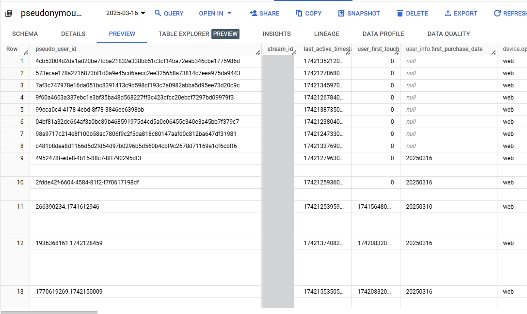 The pseudonymous user table contains user-level data such as first touch timestamp, life time value and user actvitiy predictions, etc. This table use GA generated pseudonymous identifiers (pseudo_user_id). This identifier is generated by Google Analytics using a combination of business provided user ID, Google Signals and User Device ID.