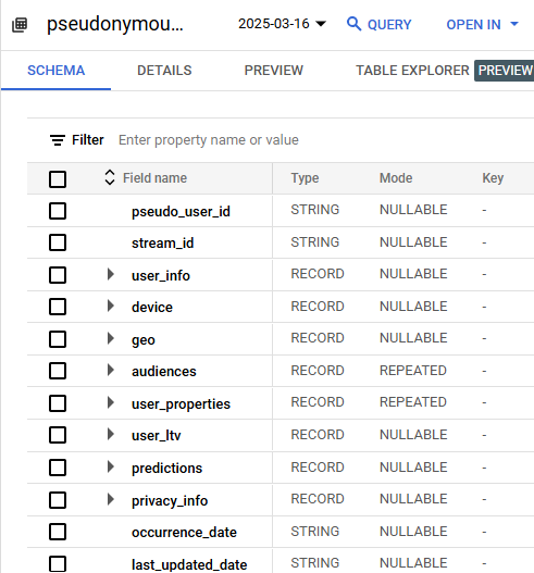 - The ‘Audiences’ configured in Google Analytics interface are available in this export. This means you can export Google Analytics audience list to GCloud using this table.