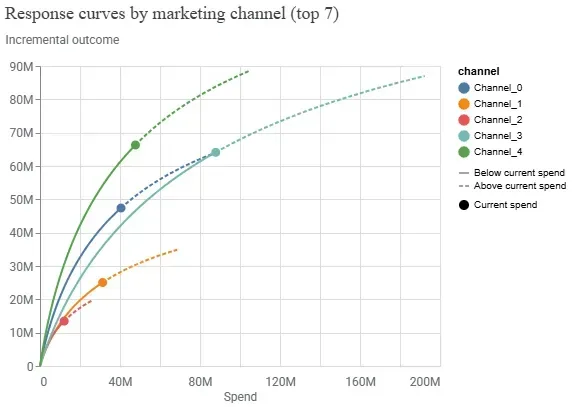 Example Meridian response curve graph for different marketing channels.