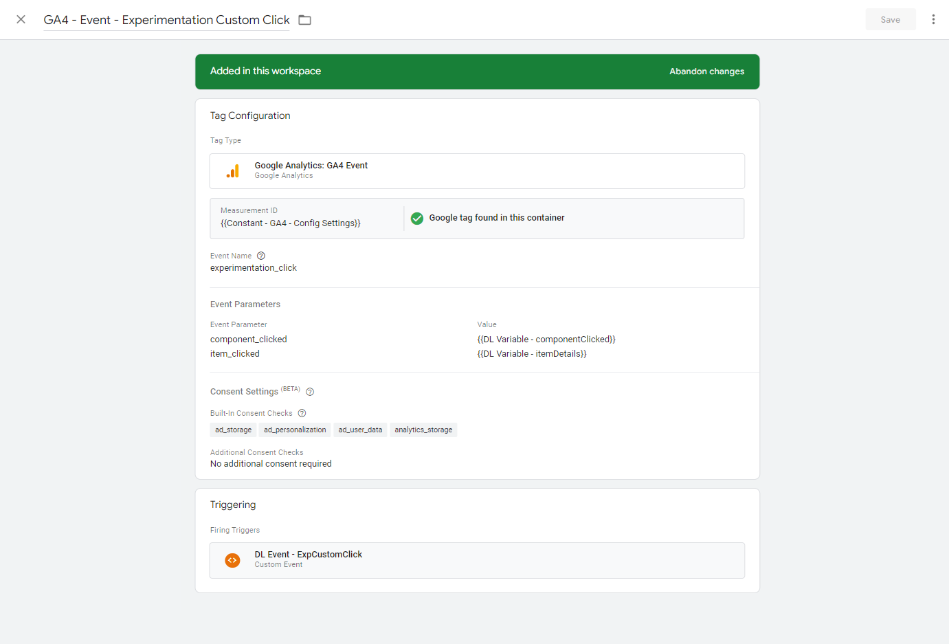 With this one time set up, you can now pass custom events from every experiment (if needed!) into GA4. The only piece that will need to be changed with each test is the values that are passed to the dataLayer, everything else will remain as is and the data will appear in GA4 to use for your post experiment analysis.