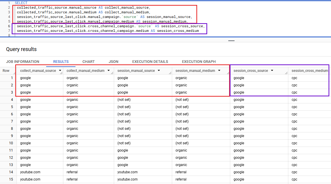 A common mistake a lot of GA4 BigQuery users make in the beginning is that they naturally use traffic_source fields to query source, medium and campaign values. It is important to highlight that these are user level traffic source. As mentioned in my previous article, user level campaign name, source and medium are collected from the url when a new user first landed on the site. These values are assigned to first_visit event, and will persist throughout a user’s lifetime on your website, as long as the user_pseudo_id retains.