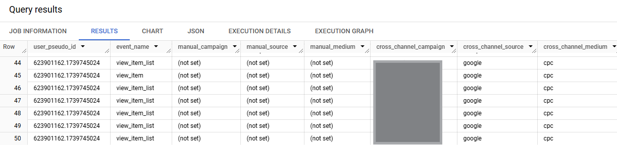 In below example, not all events in each session contain the campaign name, source and medium values because these query parametres don’t exist in the URLs when, for example, a scroll event happens: