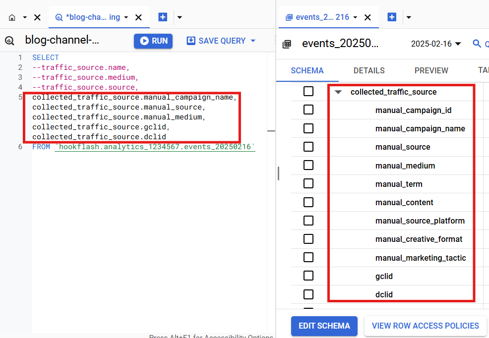 The fields under ‘collected_traffic_source’ contain a lot more traffic source information, these are collected at every single hit base on the URL each event is tied to.