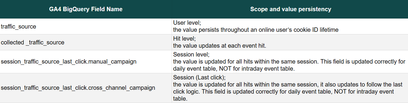 At the time of writing, the below four groups of records log traffic source related information in BigQuery’s GA4 event table: