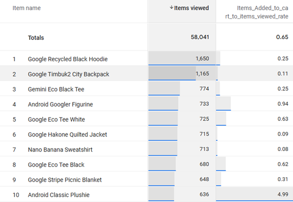 You can then build an Exploration using these metrics, either to see what the aggregate figures are, what they look like charted over time, or split by Item or page path. You can see an example from the Google Merchandise Site here: