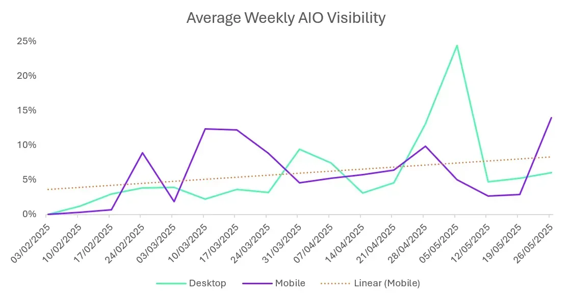 - +6.5% Average Daily AIO Visibility: A sustained and meaningful improvement in their presence within AIOs across their keyword set which continues to trend upwards as we go.