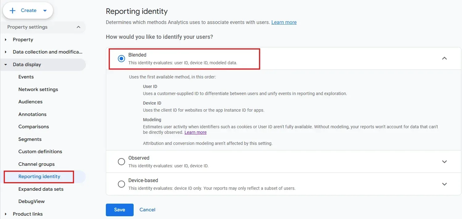 To enable effective modelling in GA4, you need to select the blended reporting identity in GA4’s admin.