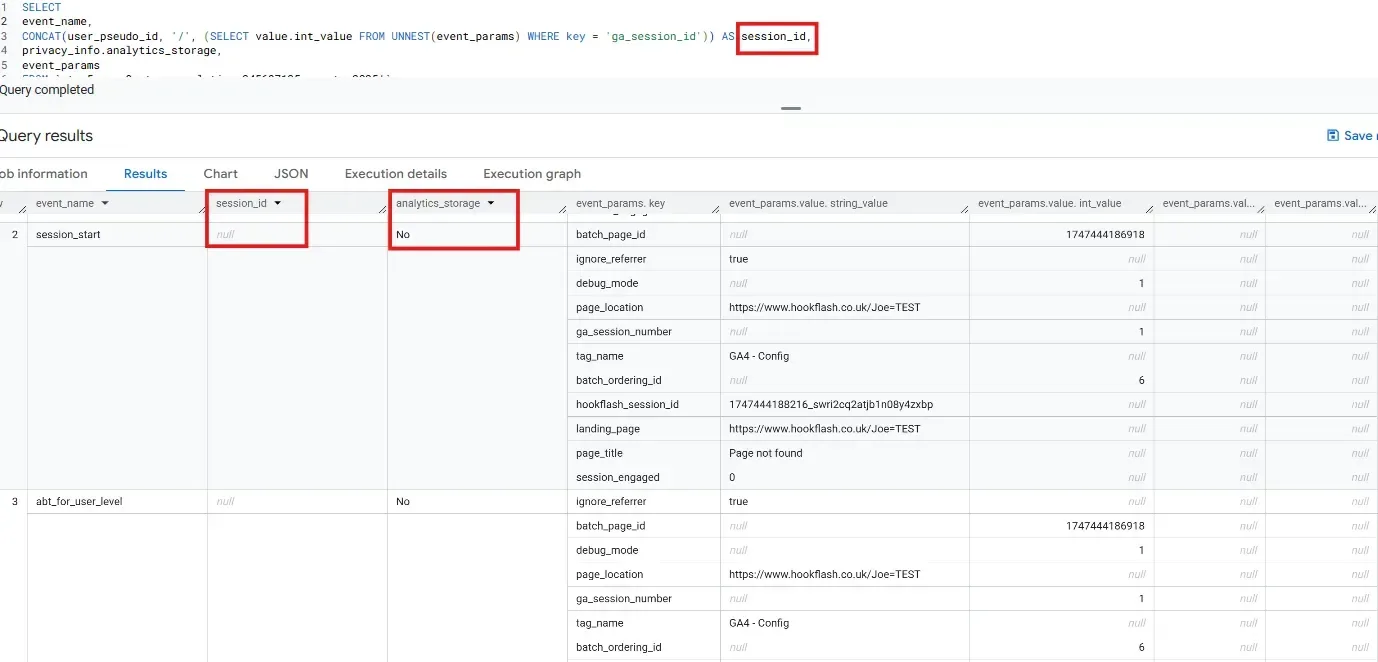 In the example below, use_pseudo_id, ga_session_id and traffic source fields are all ‘null’, but you can still see event values: