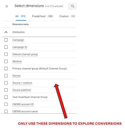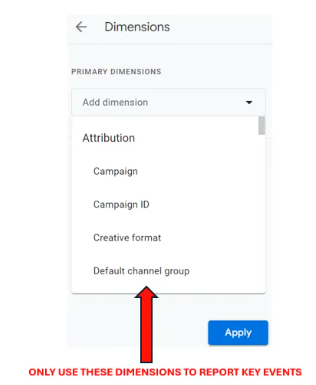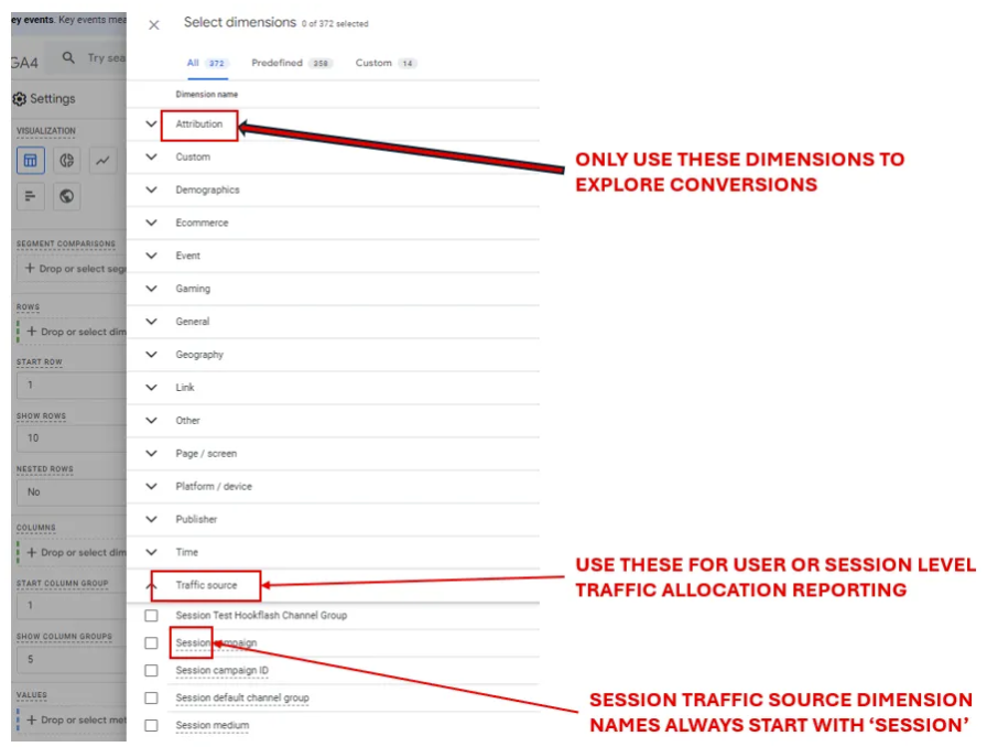 Once you have set up key events and have chosen the preferred attribution model, you can start building reports in GA4 to analyse channel conversion performance. In GA4 UI, custom dimensions under ‘Attribution’ section should be used to report conversion. Note this is the ONLY time you would use the dimensions under Attribution section, you should never use these dimensions if you are reporting other none-conversion events. This applies to both GA4 ‘ Reports’ and ‘ Explore’ .
