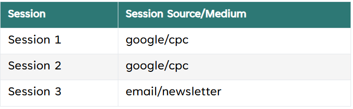 Based on the logic discussed in this article, the following tables illustrate how conversions, session source/medium, and user source/medium are calculated: