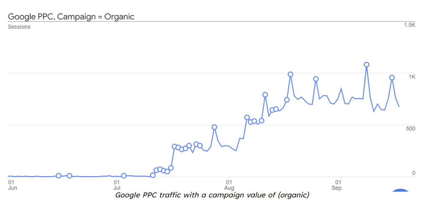 We have seen multiple instances where traffic coming from Google PPC, with a campaign name of (organic), have risen, all around the same date in early July, as can be seen in the graph below.