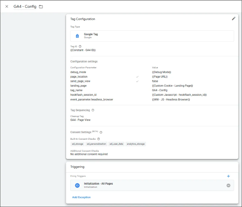 The eagle eyed among you may have noticed that the screenshot above has a parameter "send_page_view" set to false. This prevents the page_view event from being sent by the config tag. This kind of set up is usually adopted when you want to send the page_view event only after a specific dataLayer push. Perhaps you want to send custom page groupings or user provided data on a page_view event, if so, you'll want to make sure the page_view event is fired only when that data is available. If that dataLayer push doesn't exist on some pages then you won't be firing a page_view event and will end up with "(not set)" landing pages.