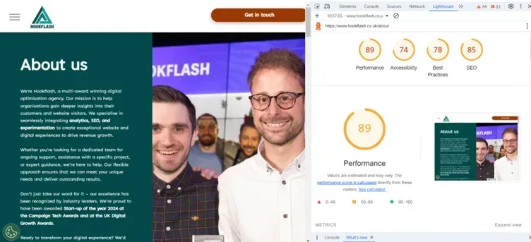 Curious as to what these scores may be on your site? You can check it in your browser! If you navigate to your site, open dev tools and select “Lighthouse” from the menu, you can run a quick test on any given page for desktop or mobile like I have done on the Hookflash site:
