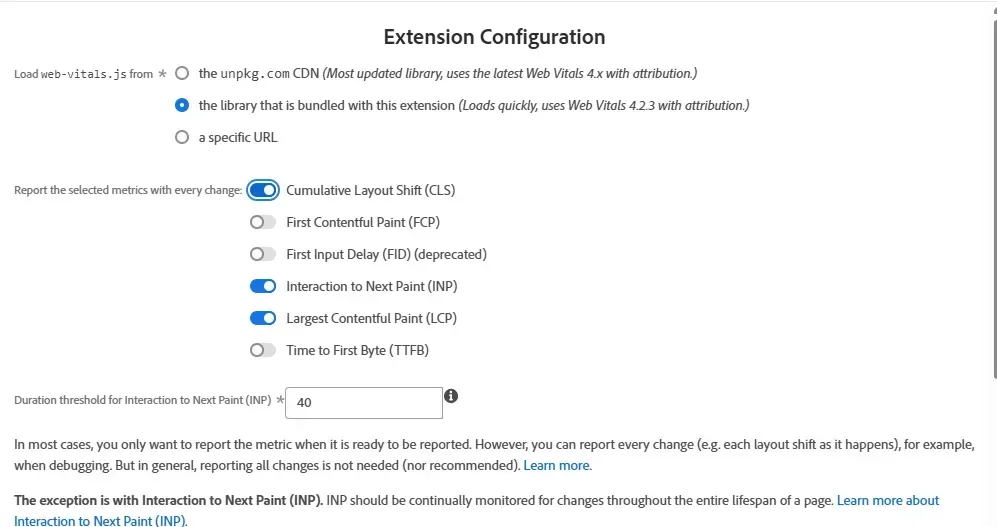 2) Configure the extension according to your needs (i.e. which metrics/web vitals you want to track – this may important, but more on that later):