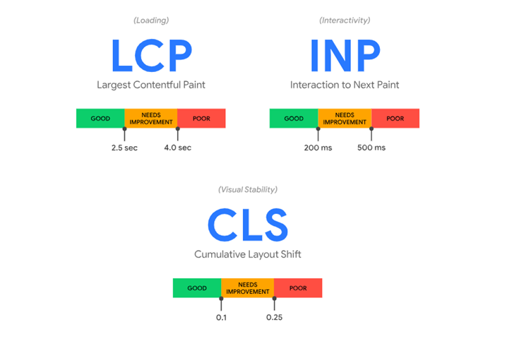 - Interaction to Next Paint (INP): This measures responsiveness when users are interacting to different parts of your site.