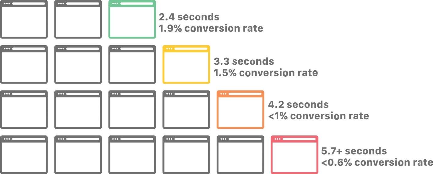1) Measure and improve your user experience – As mentioned previously, the users on site experience has never been more important. Web Core Vitals focus on the core aspects of user experience. By tracking these metrics, you can identify and address pain points that could be causing frustration or disengagement among users. Page / content load times in particular have been proven to have a direct correlation with bounce rate, as well as conversion rate: