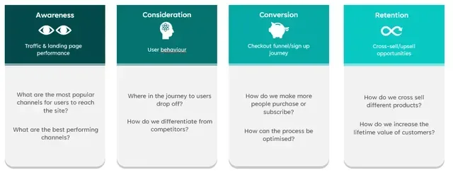 - Conversion - focuses on the checkout funnel/sign up journey