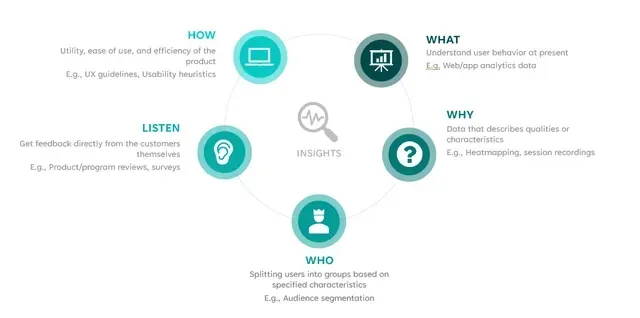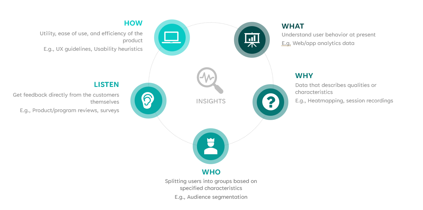This centers around understanding the user behavior and what is happening on your website or app. This data generally takes a quantitative format and be found through web/app analytics data from sources like Google Analytics, Adobe analytics or Mixpanel.