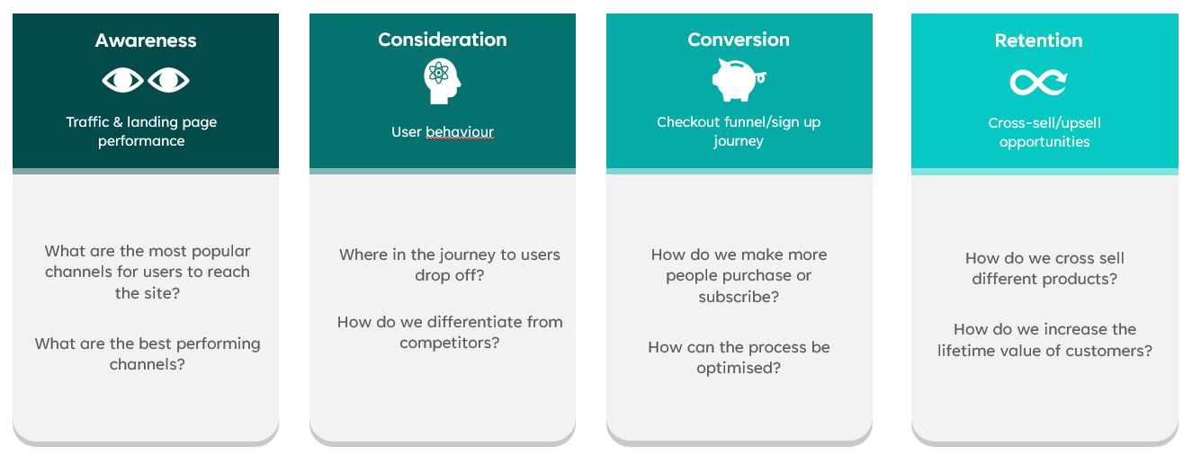The questions can be grouped whatever way works best for you but a popular structure amongst our clients is to focus on the funnel. For example: