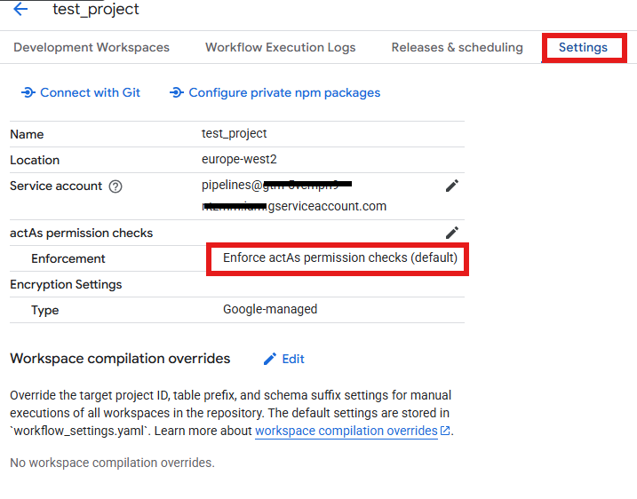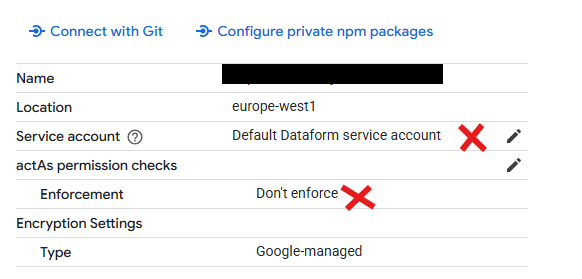 - Make sure the ‘Service account’ is selected to use a custom service account you created, not ‘Default Dataform service account’