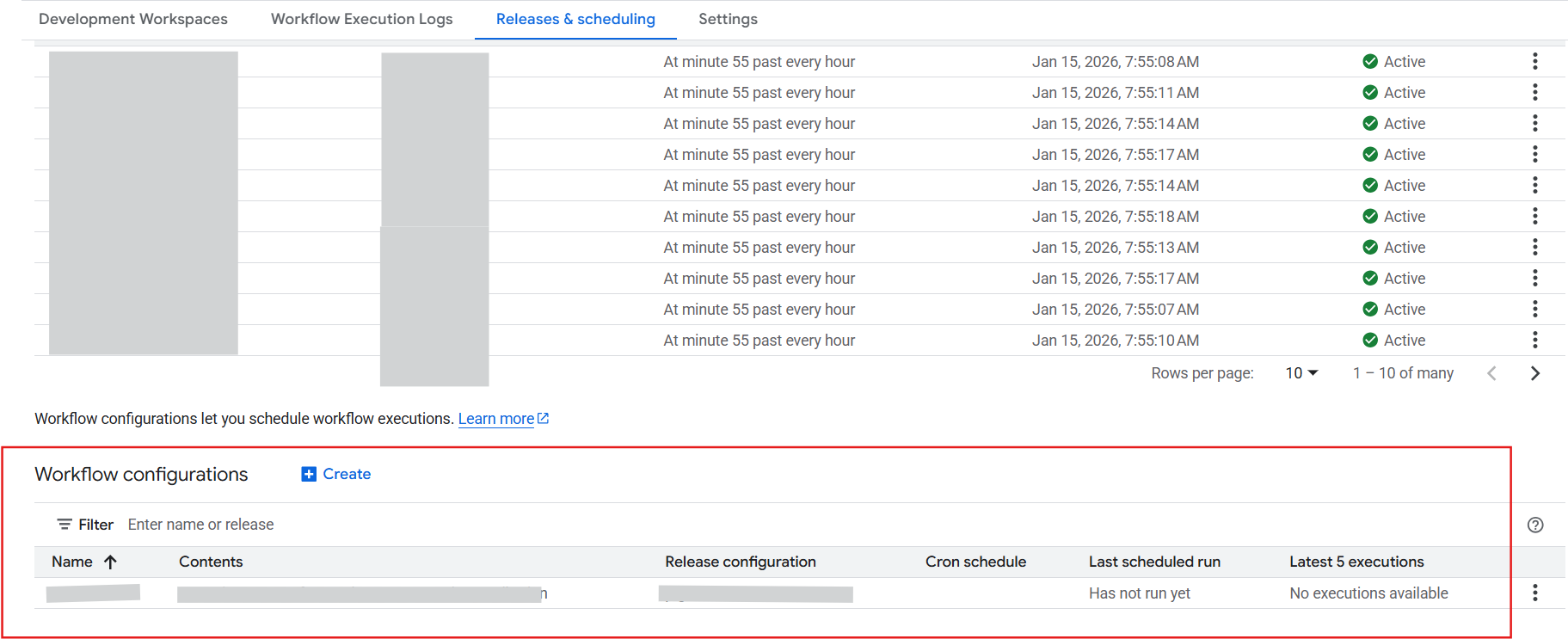 In a Dataform workspace, go to ‘Releases & Scheduling’. Click into each configuration under Workflow configurations section.